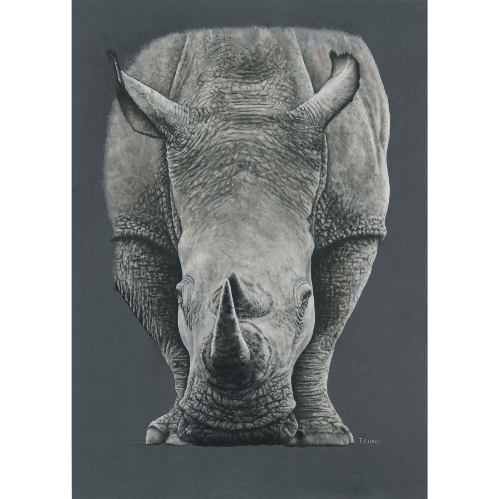 “I don’t want to ever imagine a time when there aren’t any rhinos living in the wild. Having witnessed the results of poaching first-hand, I created this piece to celebrate the magnificence of these pre-historic looking mammals. It was a pleasure to watch and photograph this female rhino in South Africa in 2017 and I’ve loved bringing her to life on paper. Those horns might be a downfall for the species but I wanted them to be the centre of attention in my artwork as they represent ‘a symbol of hope’ that the future world will recognise where they truly belong.”