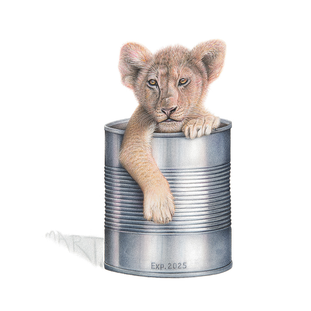 “This artwork helped to secure a commitment from the South African government to end the industry of captive lion breeding in the country. Drawn in 2020, I included an expiry date of 2025 on the can to reference the age at which a lion born in captivity can expect to lose its life in a canned hunt. Exhibiting it in 2025 allows us to reflect on the state of the industry now. Sadly the wheels of justice turn slowly, and the practice of captive lion breeding and canned hunting continues.”