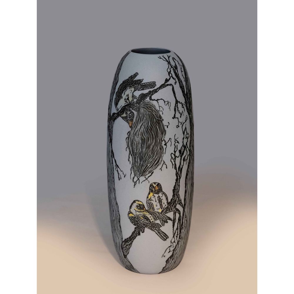 A statement porcelain vase decorated in her distinctive sgraffito style with applied sprigs and gold lustre, by accomplished ceramic artist Eunice Botes, who lives and works in the Gauteng province of South Africa.