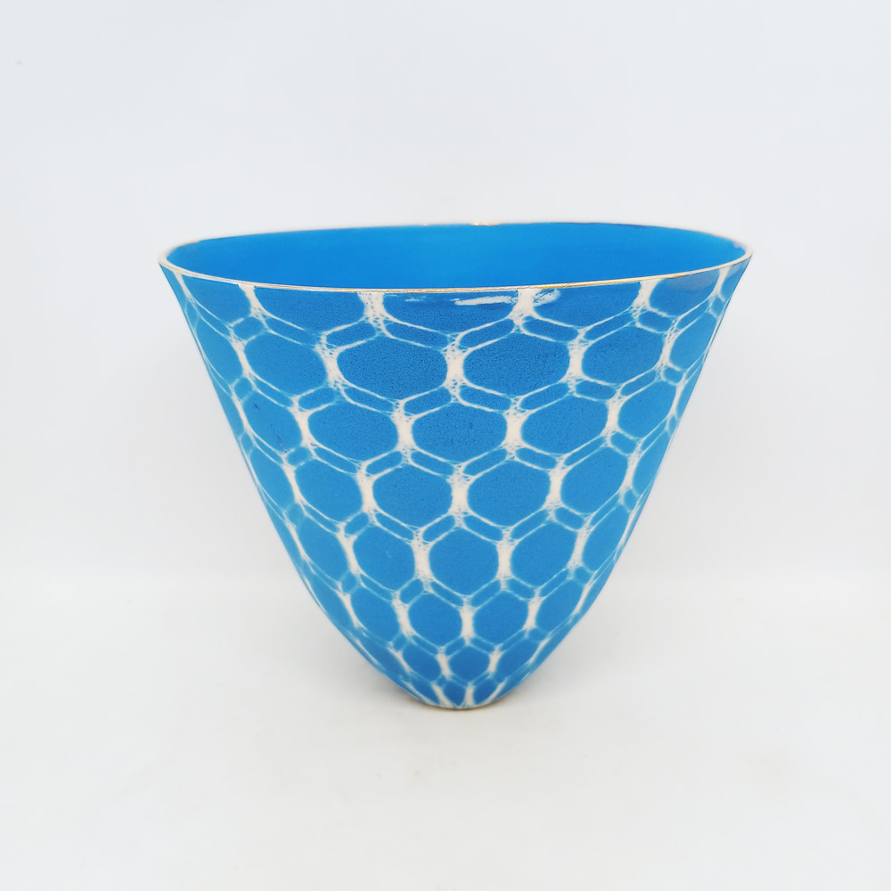 A small porcelain vessel in a clear blue hexagonal design by Johannesburg ceramic artist Sandy Godwin. Sandy is well known for her refined shapes, nostalgic use of lace, both vintage and modern, and a delicate gold rim to finish her vessels.