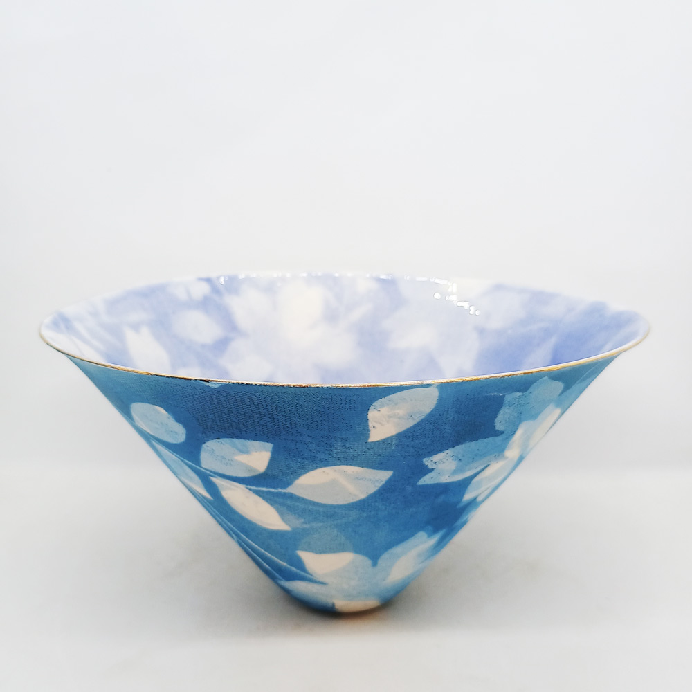 A wide open porcelain bowl with an attractive outer design of leaves by Johannesburg ceramic artist Sandy Godwin. Sandy is well known for her refined shapes, nostalgic use of lace, both vintage and modern, and a delicate gold rim to finish her vessels.
