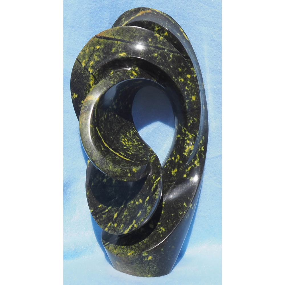 A striking abstract indoor sculpture in distinctive leopard rock by Zimbabwean stone sculptor Willard Bopoto.