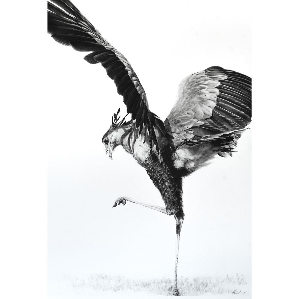 This piece is about more than anatomy or realism – it’s about intention. The Secretary Bird doesn’t stalk from the sky like most raptors; it hunts on foot, delivering lightning-fast kicks to dispatch snakes and small prey. That grounded power, the sheer audacity of a bird that fights with its feet rather than its beak or talons, is what drew me in.I chose to isolate the figure against a minimal background to highlight the energy of the gesture – one leg raised, wings spread, the tension of the moment suspended in time. It’s a pose that speaks to precision and instinct, and I wanted the viewer to feel that coiled momentum, as if the strike could land at any second.