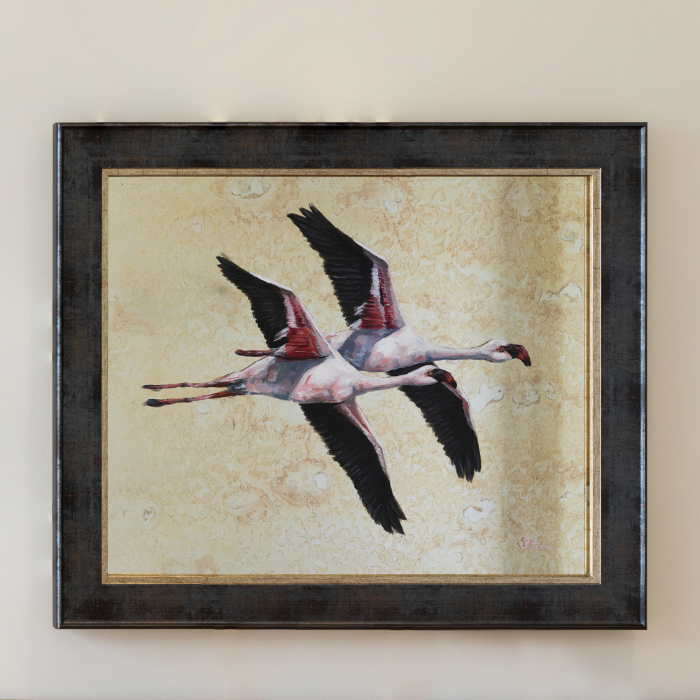 A strong and unusual painting in durable acrylic on an antique mirror of a pair of flamingo in full flight by wildlife artist Sophie Harden who travels extensively through Africa and gains her inspiration first hand.