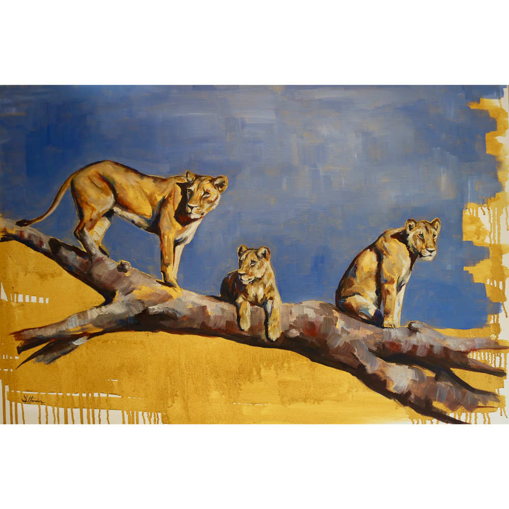 “Captured from a personal photo of lions waiting patiently for the midday heat to subside before venturing out on a hunt. The lions are individually in their pose of rest and interaction, seemingly talking among themselves. The vivid blues and yellows perfectly capture the intensity and heat of their environment.”